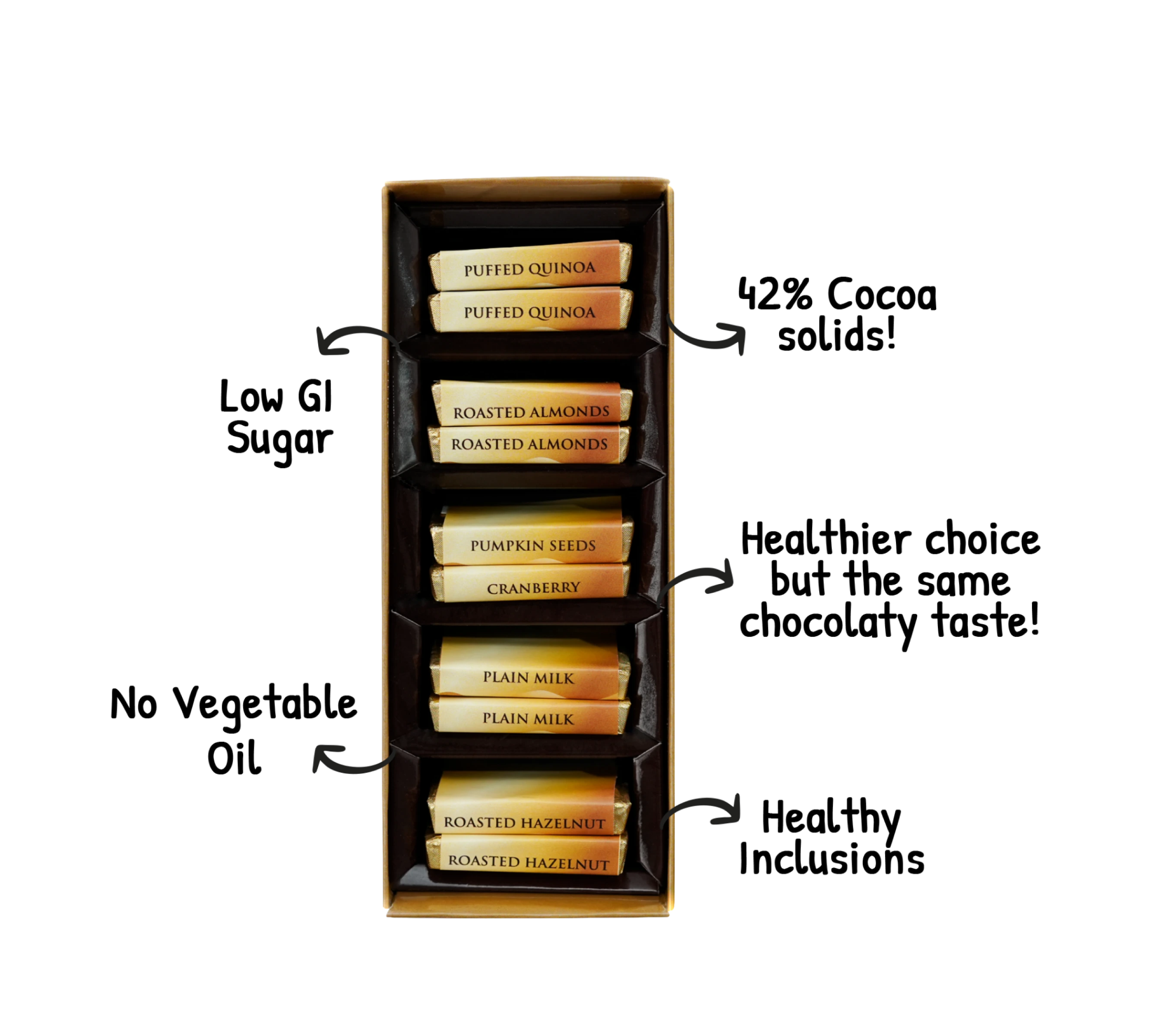 Indulge in a luxurious selection with Maccao's Assorted Milk Chocolate Box, featuring 2 pieces of each of our carefully crafted milk chocolate variants. The box includes smooth & creamy Plain Milk Chocolate, rich & nutty Roasted Almond Milk Chocolate, light& crispy Puffed Quinoa Milk Chocolate. creamy & crunchy Roasted Hazelnut Milk Chocolate, fruity cranberry milk Chocolate, and wholesome & crunchy delight with Pumpkin Seed Milk Chocolate.